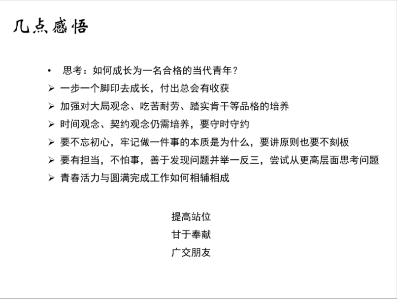 最后,曹学长分享了自己的几点感悟。他鼓励大家去思考如何成长为一名合格的当代青年,实现自我和社会价值;他还向大家强调了成长经历的重要性,希望大家不要急功近利,要一步一个脚印去成长;作为新时代的大学生,曹学长认为,我们自己应当有担当,要善于发现问题并举一反三,尝试从更高层面思考问题。
