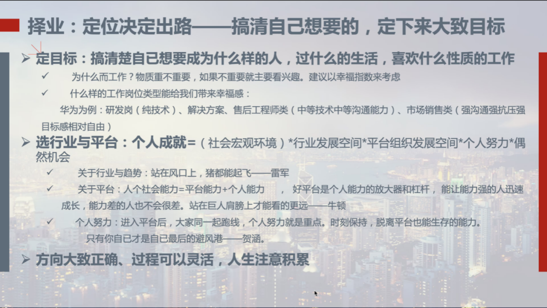 择业是开始求职工作的第一步。选择一份职业,首先需要弄清楚自己所想要的是什么,给自己一个大致的目标。学长建议大家在明确自己未来的大致方向后,努力加强自身能力,再综合考虑“行业”和“平台”两方面因素,把握行业发展趋势十分重要;好的平台是个人能力的放大器和杠杆,站在平台的基础上,可以帮助自己快速成长起来。