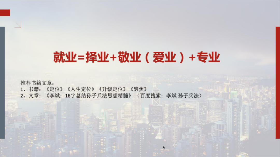 学长提出“就业=择业+敬业+专业”的观点,嘱咐同学们要勇于自我探索,自我认知,在工作和学习中积极进取、专注效率,以取得满意的结果。