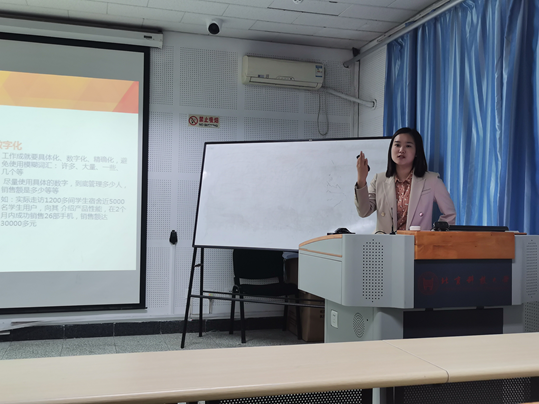 杨佳佳老师先向同学们介绍简历制作的方法和技巧。她讲到,在正式开始简历制作前,同学们应先对自身的知识和能力有所了解,同时通过企业公布的岗位要求和岗位职责对岗位有明确认识,在此基础上,根据人岗匹配的原则选定意向岗位,为自身寻找科学的求职目标。随后,她针对制作简历的六项基本内容,逐一进行讲解,强调简历一定要突出个人优势。