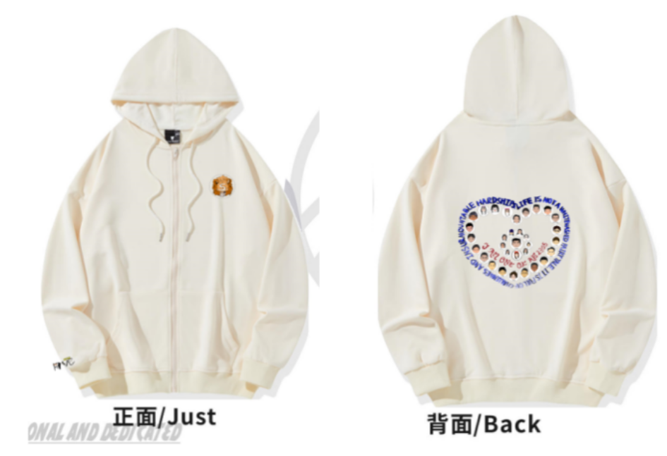 2305班作为本次大赛的冠军,更是设计的独具匠心。以米白色为班服主色,正面班徽主体为一只蓬松可爱的小狮子,背面是的爱心由沙导、小班和班级每位同学的卡通形象组成,这象征着五班同学在沙导和小班的带领下,将心凝聚在一起,聚是一颗心,散是满天星。