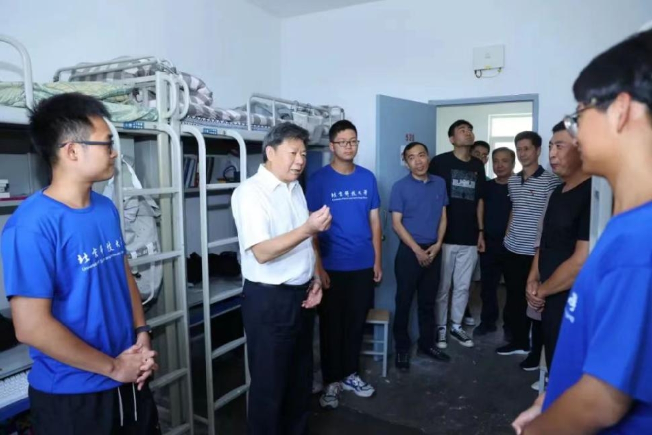 迎新期间,杨仁树校长一行走进11斋学生宿舍看望工科试验班的同学们。杨校长与大家热情交谈,询问了同学们进入大学后的适应情况,并就本科生导师制、宿舍生活等方面进行详细交流。杨校长亲切地对大家说,在宿舍生活时,遇到问题可随时向后勤工作人员反映并寻求帮助,学校一定会尽力解决。同学们对杨校长的到来表示热烈欢迎,并纷纷表示会在未来的学习生活中,乐观向上,积极进取,在北科开启人生新旅程。杨校长还与新生家长面对面交流,就住宿环境、校园生活、学生成长成才等方面与家长们进行坦诚而深入的对话。