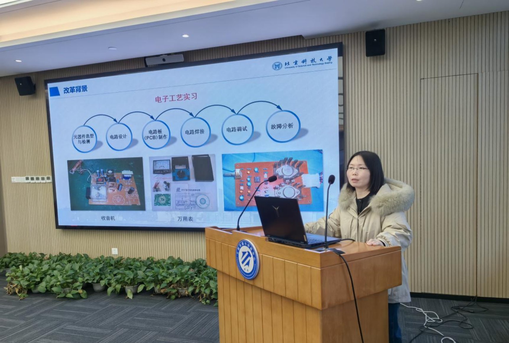 业务交流环节,28圈娱乐 电子实习基地主任白艳茹作了题为《北京科技大学电子实习基地实验教学改革探索》的报告,系统介绍了电子实习基地的基本情况、改革背景、开课对象、课程改革难点与举措、素质拓展课程建设以及“电子创客营”系列活动,总结了电子实习基地体系改革的探索与思考。