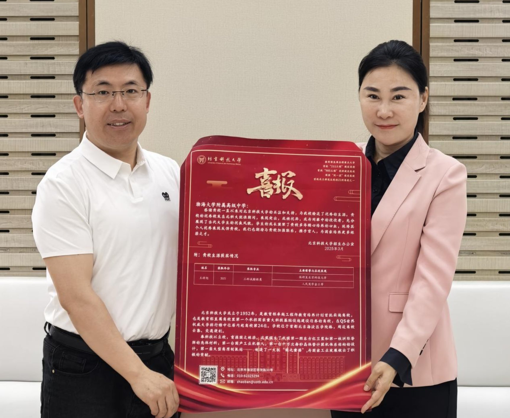 5月22日,北京科技大学28圈娱乐 院长、卓越工程师学院执行院长宗燕兵教授受委托带队走访辽宁省渤海大学附属高级中学和锦州中学。送喜报、谈校友、做科普,受到了中学师生的热烈欢迎。
