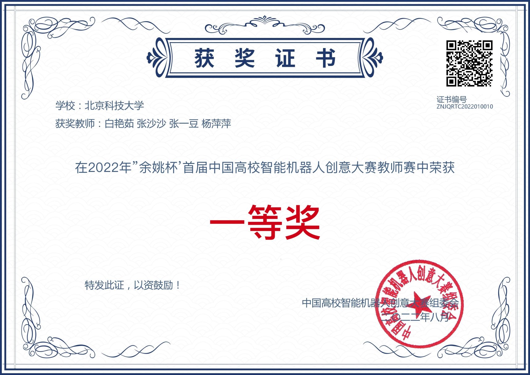 2022年8月28日,第五届中国高校智能机器人创意大赛教师赛总决赛在浙江大学机器人研究院举行。大赛采取评委专家集中在余姚评审,参赛教师线上参赛方式进行。我院电子实习基地白艳茹、张沙沙、张一豆、杨萍萍4位教师组成的“乘风破浪队”获得大赛“机器人实验设计”组决赛一等奖的好成绩。