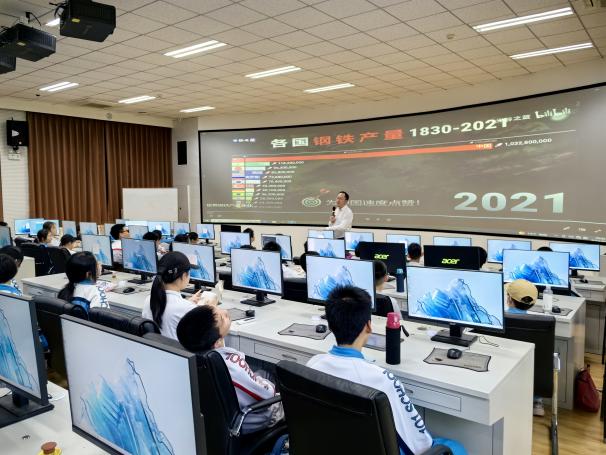 随后,刘院长详细解释了钢与铁的区别,通过生动的比喻和实例,让学生们有了更清晰的认知。紧接着,一段展示1830年至2021年各国钢铁产量变化的视频将学生们的视线带入了全球钢铁产业的发展历程,将整个授课过程推向了高潮。